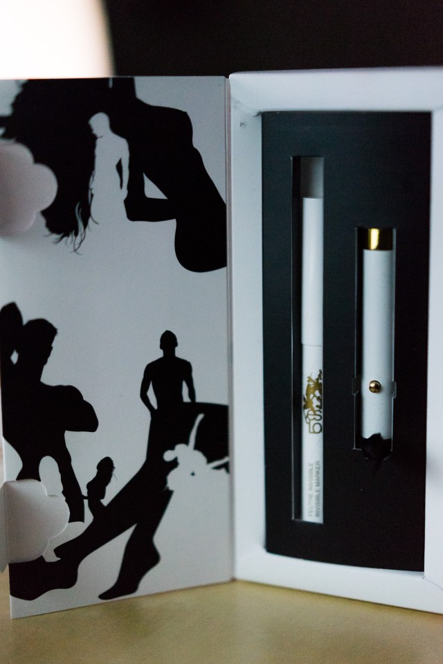 J’ai aussi testé le Kit de Cache-Cache sur ma main, pour voir, car j’avais pas mal d’idées en tête pour ce petit truc, mais je restais très sceptique aussi (je ne crois en rien, on dirait). Dans la boîte, un petit feutre qui est donc sensé être invisible et qui se révèle à l’aide d’une petite lampe à UV fournie également. Le tout est idéal pour faire passer un message à votre chéri·e, ou alors pour pécho en boîte, j’attends vos idées ! Et ben je vous le donne en mille : ça marche super bien c’est TROP beau et j’ai grave envie de m’en servir pour une séance photo ou pour des vidéos dans le futur !