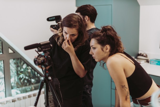 Deux mois plus tard, on avait tous rendez-vous au cabinet (qui était climatisé heureusement car c’était en août). En plus de Nyx et moi, il y avait Ivan Sobris pour nous aider à filmer, Barth pour faire les photographies plateau, et Ser Lait qui était en stage de fin d’études dans ma société à ce moment et qui est la monteuse de pratiquement tous les courts-métrages de Carré Rose Films.