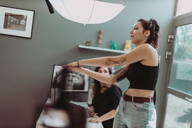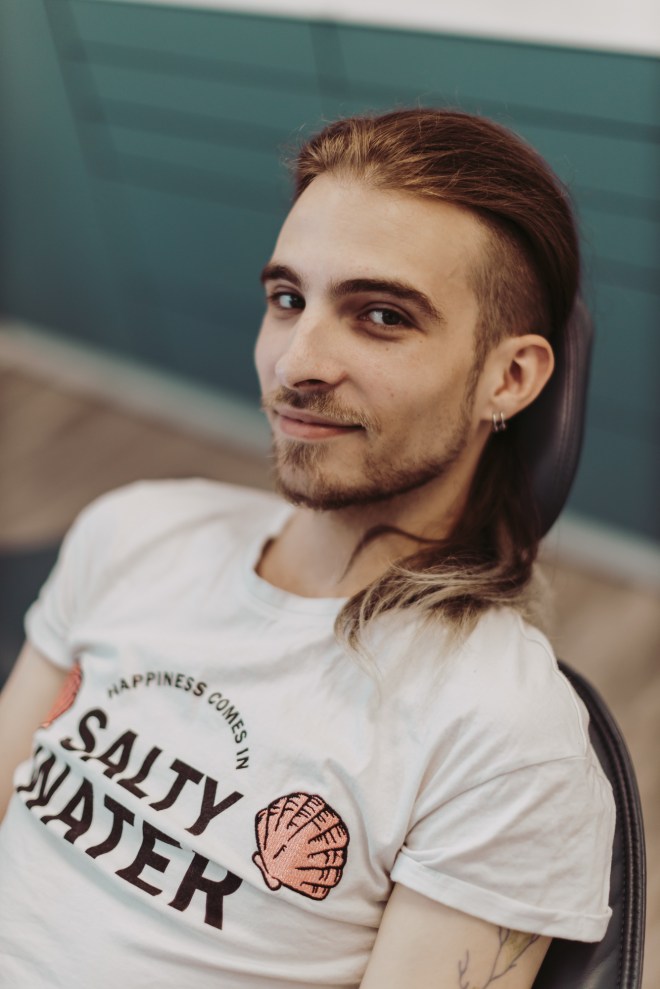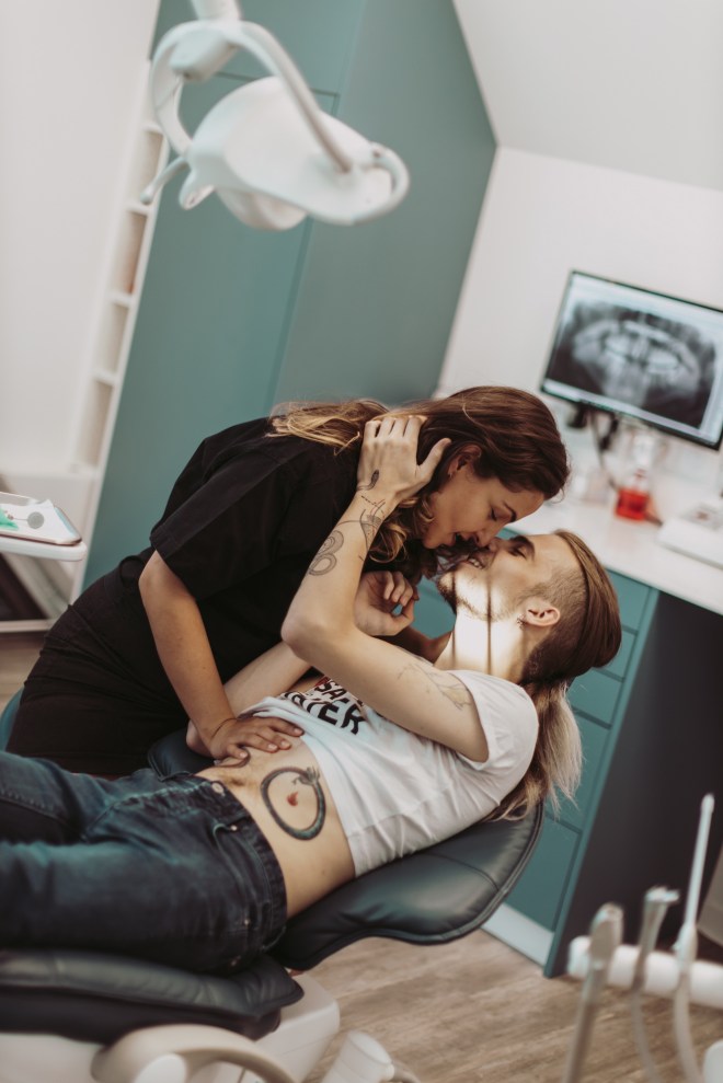 Dans le rôle du patient, il a tout de suite été évident que ce serait Nyx, déjà parce qu’iel à la langue splittée, et parce que je voulais quelqu’un dont le style contrasterait avec celui de la dentiste légèrement BCBG. Il me fallait quelqu’un de jeune, de queer, avec un look un peu hors du commun. Iel était donc tout·e indiqué·e pour le rôle, et filmer Nyx me permettait en outre de montrer un corps perçu comme masculin qui s’éloigne des clichés de la masculinité hyper virile qu’on retrouve trop souvent dans le porno mainstream.