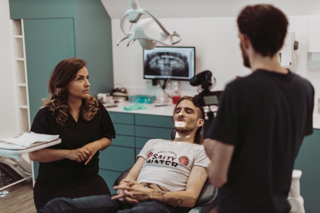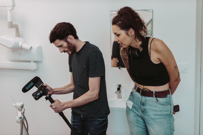 Donc, dans « Détartrage » je joue le rôle d’une dentiste relativement sage qui reçoit un nouveau patient. Je voulais renverser les dynamiques de pouvoir des films avec des docteurs, et pour une fois, montrer une femme médecin et le patient sur la chaise (car la plupart du temps c’est l’inverse). Ayant quelques amis dentistes de mon âge, je me disais qu’au moins pour une fois, avoir plus de 35 ans pouvait donner une crédibilité supplémentaire au rôle.